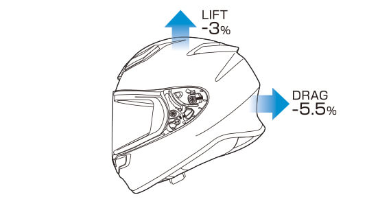 新設計的CWR-F2鏡片上配備的渦流發生器可抑制騎士耳朵附近的鏡片旁行駛風的湍流並降低風噪聲。